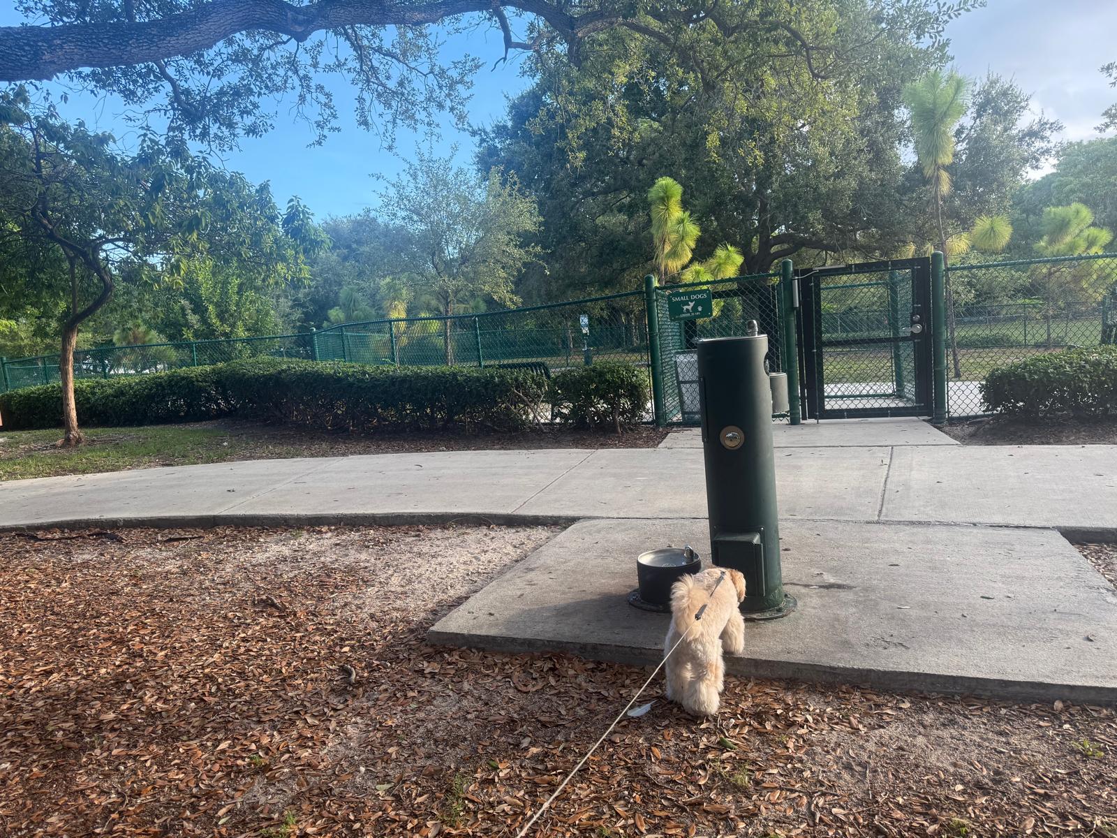 The park includes two fenced dog pens, split for small (under 35 lbs) and large dogs. Shade trees, benches, and a dog-height water fountain make it easy to linger while your pup socializes. The size separation keeps play styles balanced, and the sightlines across the pens let owners keep an eye on everything.